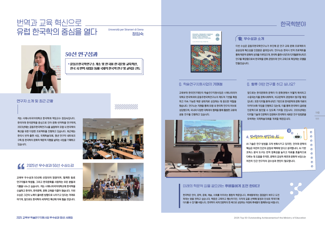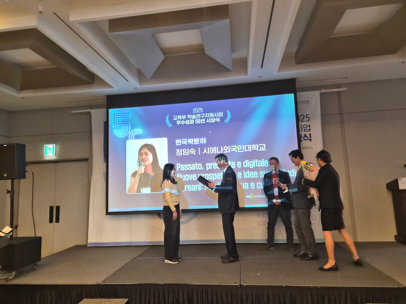 Lo scorso novembre il Ministero dell’Istruzione della Repubblica di Corea ha selezionato cinquanta studiosi di tutto il mondo che si sono distinti nei rispettivi ambiti di ricerca. Tra questi, quattro sono stati premiati per il loro contributo agli studi umanistici e, in particolare, per l’impegno nella diffusione della lingua e della cultura coreane. Il riconoscimento assegnato è il Ministerial Award for Outstanding Performance in the Academic and Research Support Program of Korean Studies (Premio del Ministero dell’Istruzione e della Ricerca per l’Eccellenza nel Programma di Ricerca e Sviluppo degli Studi Coreani). La professoressa Jung è rientrata in questo ristretto gruppo, diventando la prima studiosa nella storia della coreanistica in Italia a ottenere un riconoscimento di tale rilievo. La sua candidatura è stata sostenuta sia dal progetto di ricerca da lei diretto come PI (Direttore scientifico del progetto) — il Seed Program for Korean Studies, finanziato dall’Academy of Korean Studies — sia da una serie di pubblicazioni recenti da lei curate, tra cui: - Passato, presente e digitale. Nuove prospettive e idee sugli studi coreani: storia, lingua e cultura, Quaderni CeSK – Orizzonti coreani “hanul” 2, Pacini Editore, 2024;- Antologia di poesia coreana contemporanea, vol. 1 – Nel verde di mia madre e del mio cuore, Orientalia Editrice, Collana Quaderni CeSK – Orizzonti coreani “hanul” 3, 2025 La cerimonia del premio si è tenuta a Seoul il 9 dicembre 2025 in presenza del Vice ministro dell’Istruzione e della Ricerca, il presidente della National Research Foundation of Korea e il vice presidente della Korean Studies Promotion dell’Academy of Korean Studies.