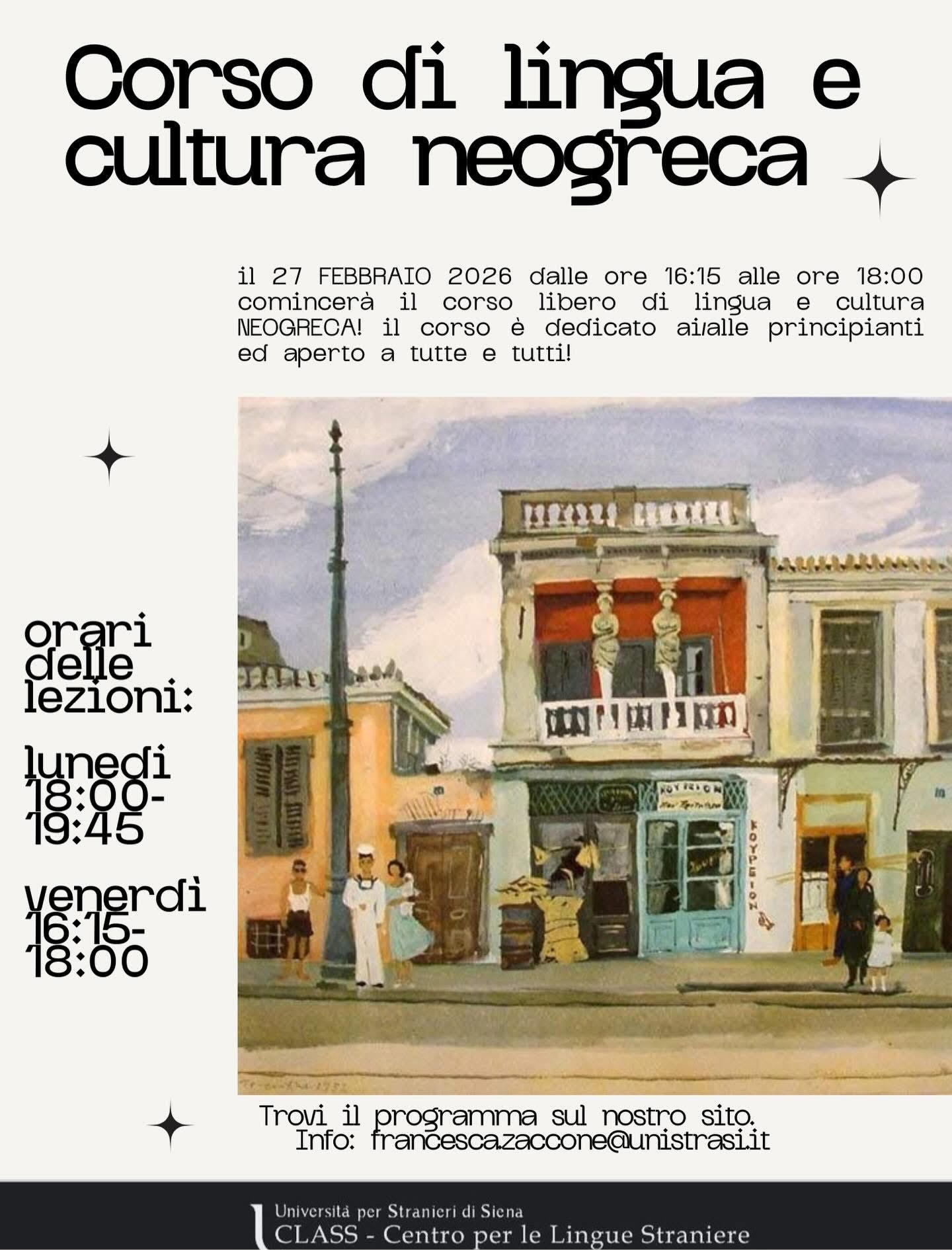 Il corso è rivolto a principianti e a tutti/e coloro che desiderano acquisire le basi della lingua neogreca, è aperto a tutte e tutti e non sono richieste conoscenze preliminari né iscrizioni.
