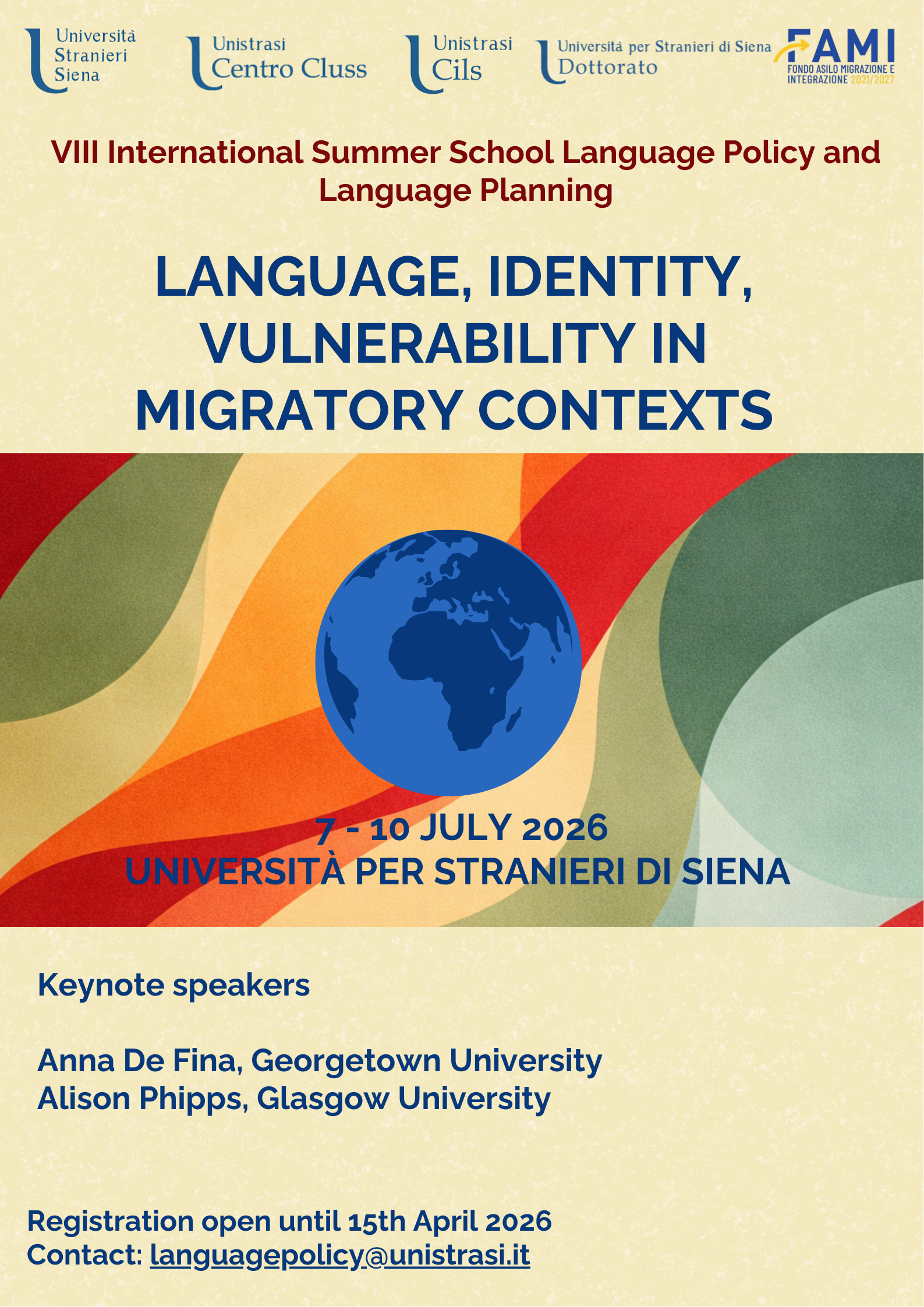 L’Università per Stranieri di Siena e il Centro CLUSS, in collaborazione con il Centro CILS (progetto FAMI PROFT) e il programma di Dottorato in Linguistica storica, linguistica educativa e italianistica (Curriculum 1), organizzano dal 7 al 10 luglio 2026 l’VIII International Summer School in “Politiche