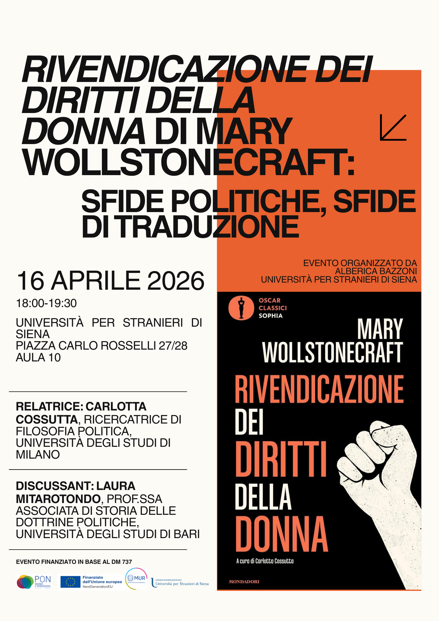 Giovedì 16 aprile alle 18 nell'aula 10 Simone Weil della sede didattica di Piazza Carlo Rosselli, sit terrà la conferenza dal titolo "Rivendicazione dei diritti della donna" di Mary Wollstonecraft: sfide politiche, sfide di traduzione.